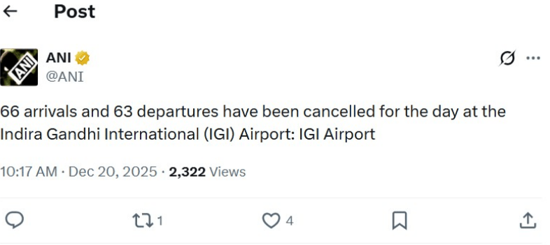 ઇન્દિરા ગાંધી આંતરરાષ્ટ્રીય વિમાનમથક (IGI Airport) તરફથી હવાઈ મુસાફરો માટે એક સત્તાવાર એડવાઈઝરી જારી કરવામાં આવી છે. એરપોર્ટ પ્રશાસન દ્વારા જણાવાયું છે કે હાલ ઓછી દૃશ્યતાની સ્થિતિ યથાવત છે. જોકે તમામ ફ્લાઇટ્સને શક્ય તેટલી સામાન્ય રીતે સંચાલિત કરવાનો પ્રયાસ કરવામાં આવી રહ્યો છે. મુસાફરોને સલાહ આપવામાં આવી છે કે તેઓ ઘરેથી નીકળતા પહેલા પોતાની સંબંધિત એરલાઇન્સનો સંપર્ક કરી ફ્લાઇટની તાજી સ્થિતિ જાણી લે.
