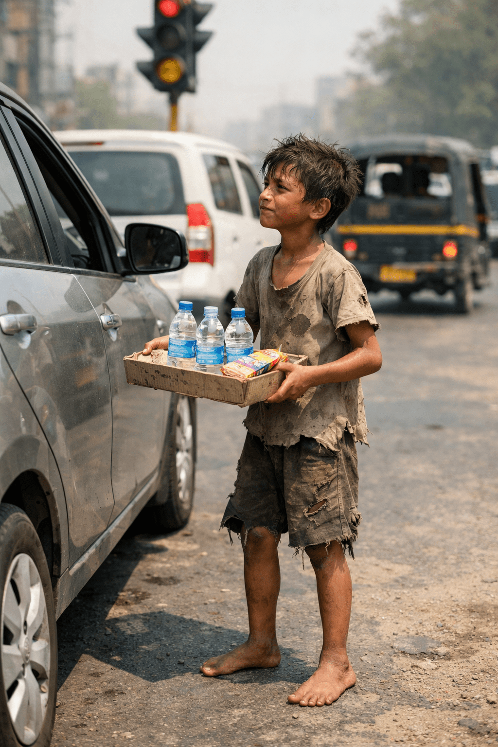 એક ગરીબ છોકરો ફાટેલાં કપડાં અને ખુલ્લા પગે ગરમીમાં ટ્રાફિક સિગ્નલ પર કંઈક ને કંઈક વેચે. મહેનત મજૂરી તેને મંજૂર હતી પણ ભીખ માંગવી મંજૂર ન હતી એ ખુદ્દાર બાળકને..ધોમધખતા તાપમા… તપતી ધરતી પર ખુલ્લા પગે ડામરની સડક પર આમથી તેમ સિગ્નલમાં એ એક ગાડીથી બીજી ગાડી સુધી દોડતો રહે અને ફૂલ કે નાનાં રમકડાં કે પેન એવી કોઈક ને કોઈક વસ્તુ વેચવાની કોશિશ કરતો રહે. બહુ મહેનત કરે. લોકો તેની વસ્તુઓને જુએ અને તેમાં પણ મોલ ભાવ કરાવે. કોઈ તેની મહેનત તરફ કે તેના દાઝતા પગને જોતું નહીં.