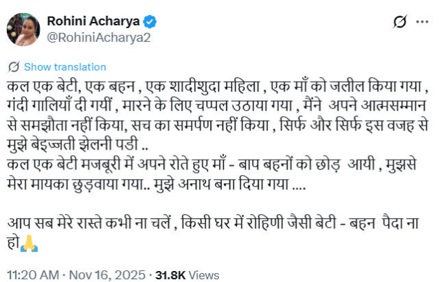 બિહારની રાજનીતિમાં ફરી એકવાર લાલુ યાદવના પરિવારના આંતરિક મતભેદો ચર્ચાનો વિષય બન્યા છે. તાજેતરમાં થયેલી વિધાનસભા ચૂંટણીમાં રાષ્ટ્રીય જનતા દળ-કોંગ્રેસ ગઠબંધનની હાર બાદ રોહિણી આચાર્યએ પરિવાર તથા પક્ષ સાથેના સંબંધ તોડવાની જાહેરાત કરી હતી. તેના પછી આજે તા. 16 નવેમ્બરે તેમણે સોશિયલ મીડિયા પર એક ભાવુક, પરંતુ ગંભીર આરોપોથી ભરેલી પોસ્ટ કરી છે.