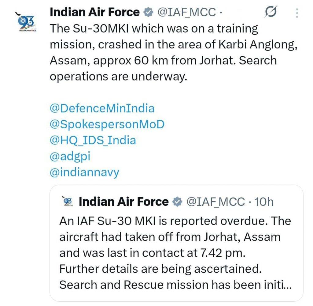 આસામમાં ભારતીય વાયુસેનાનું સુખોઈ SU-30MKI લડાકૂ વિમાન ક્રેશ, પાયલોટ્સ માટે સર્ચ ઓપરેશન શરૂ