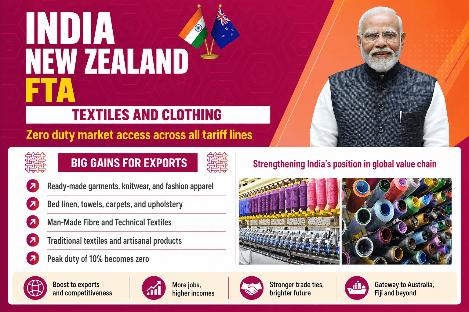 ભારત અને ન્યૂઝીલેન્ડ વચ્ચે થયેલો ફ્રી ટ્રેડ એગ્રીમેન્ટ (FTA) સુરતના હીરા અને ટેક્સટાઇલ ઉદ્યોગ માટે એક મોટો મોકો સાબિત થઈ શકે છે. છેલ્લા કેટલાક વર્ષોમાં રશિયા-યુક્રેન યુદ્ધ, પશ્ચિમ એશિયાના તણાવ અને અમેરિકા જેવા બજારોમાં વધેલા ટેરિફને કારણે સુરતના ઉદ્યોગોને મુશ્કેલીઓનો સામનો કરવો પડ્યો હતો. આવી પરિસ્થિતિમાં આ કરાર ઉદ્યોગ માટે નવી આશા લઈને આવ્યો છે. આ FTA હેઠળ હીરા અને જ્વેલરી પર લાગતી આશરે 5% નિકાસ ડ્યૂટી દૂર કરવામાં આવી છે. તેના કારણે સુરતના જ્વેલરી ઉત્પાદકોને સીધો લાભ મળશે અને તેમના પ્રોડક્ટ્સ વધુ સ્પર્ધાત્મક બનશે. સાથે જ ટેક્સટાઇલ અને ગાર્મેન્ટ્સ પરના આયાત શુલ્કમાં ઘટાડો થવાથી સુરતના કાપડ ઉત્પાદનો ન્યૂઝીલેન્ડના બજારમાં વધુ સસ્તા પડશે. અત્યાર સુધી આ બજારમાં ચીન અને વિયેતનામનું પ્રભુત્વ હતું, પરંતુ હવે ભારત માટે નવી તક ઉભી થઈ રહી છે.
