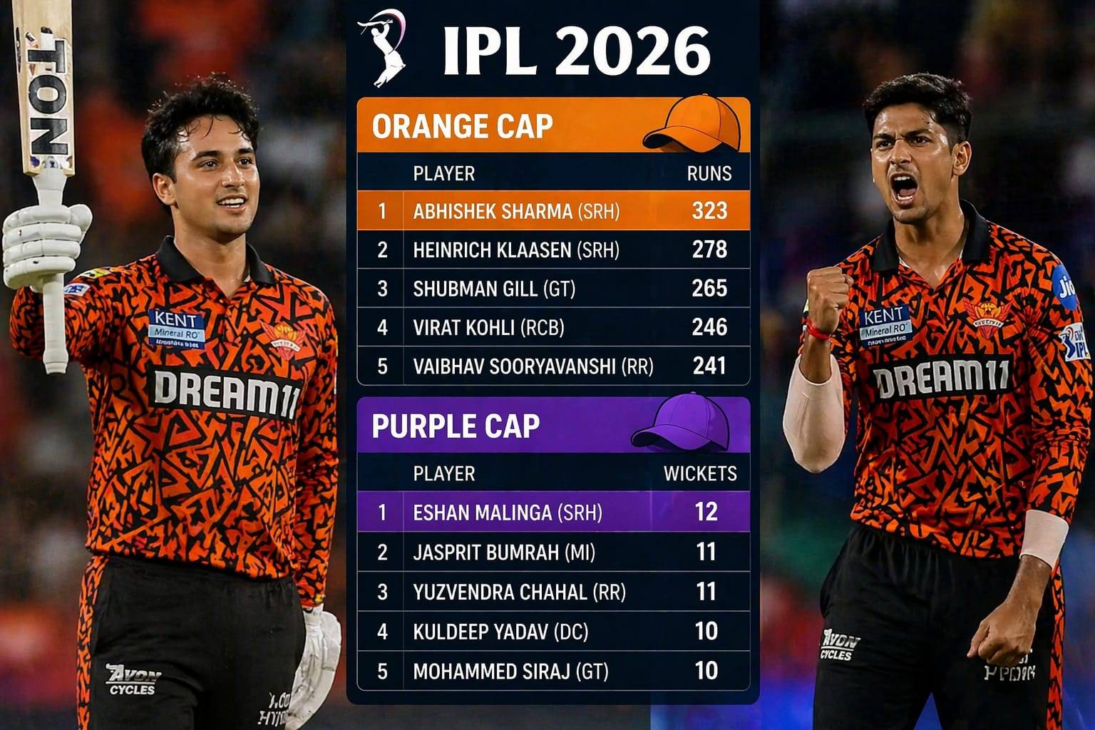 IPL 2026માં સનરાઇઝર્સ હૈદરાબાદ અને દિલ્હી કેપિટલ્સ વચ્ચે રમાયેલી મેચ બાદ ઓરેન્જ કેપ અને પર્પલ કેપની રેસમાં મોટો ફેરફાર જોવા મળ્યો છે. ખાસ કરીને અભિષેક શર્માની તોફાની સદી અને ઈશાન મલિંગાની અસરકારક બોલિંગે વ્યક્તિગત એવોર્ડ્સની રેસને વધુ રસપ્રદ બનાવી છે.