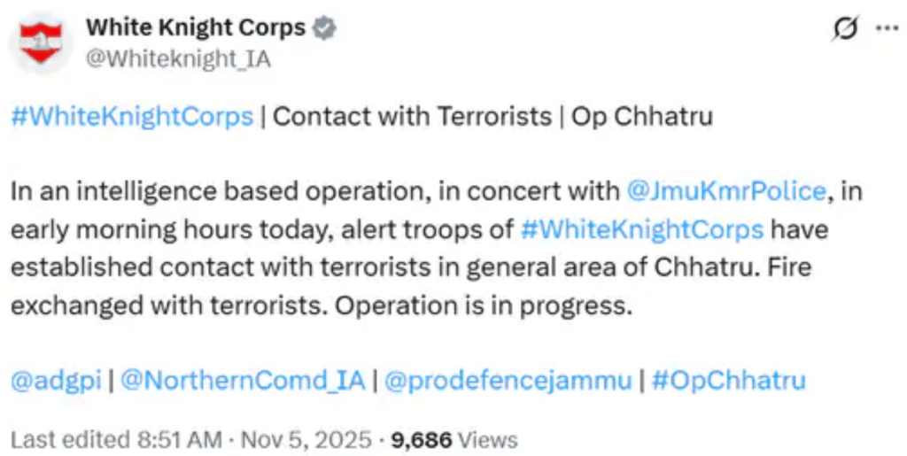 સત્તાવાર સૂત્રોના જણાવ્યા મુજબ પોલીસે આતંકવાદીઓની હાજરી વિશે ગુપ્ત માહિતી મેળવી હતી. જેના આધારે સેના, CRPF અને સ્થાનિક પોલીસના સંયુક્ત દળોએ વિસ્તારને ઘેરીને ઓપરેશન શરૂ કર્યું. આ ઓપરેશનને “ચતરુ ઓપરેશન” નામ આપવામાં આવ્યું છે. હાલ બંને તરફથી ગોળીબાર ચાલુ છે અને સમગ્ર વિસ્તારને સુરક્ષા દળોએ કડક ઘેરાવ હેઠળ લઈ લીધો છે.