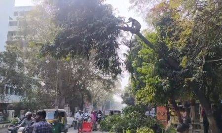 રાવપુરાના વ્યસ્ત માર્ગ પર સુરક્ષા સાધનો વિના ઝાડ કાપવાનું જોખમી ઓપરેશનહેલ્મેટ કે સેફ્ટી બેલ્ટ વિના ઉંચા ઝાડ પર ચઢેલા યુવાનને જોઈ રાહદારીઓના...