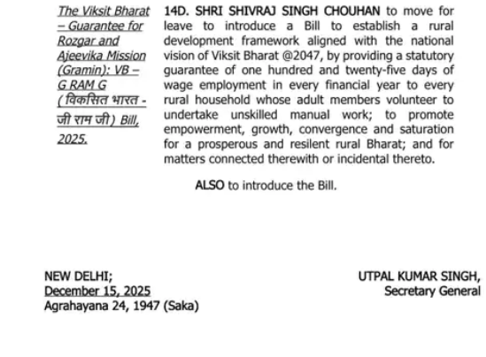 આ નવા પ્રસ્તાવિત બિલનું નામ ‘ડેવલપ ઇન્ડિયા ગેરંટી ફોર એમ્પ્લોયમેન્ટ એન્ડ લાઇવલીહૂડ્સ મિશન (ગ્રામીણ) એક્ટ 2025’ રાખવામાં આવ્યું છે. આ કાયદો સામાન્ય રીતે VB–G RAM G (Develop India Guarantee for Employment and Livelihoods Mission – Rural) તરીકે ઓળખાશે. સરકારનું કહેવું છે કે આ બિલનો મુખ્ય હેતુ ગ્રામીણ વિસ્તારોમાં રોજગારની સાથે સાથે ટકાઉ વિકાસ માટે મજબૂત માળખું ઊભું કરવાનો છે.