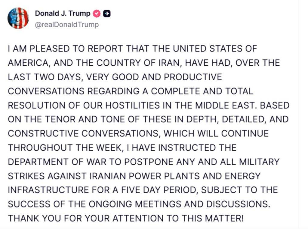 પોસ્ટમાં ટ્રમ્પે લખ્યું છે, “મને જાહેરાત કરતા આનંદ થાય છે કે છેલ્લા બે દિવસમાં, યુનાઇટેડ સ્ટેટ્સ અને ઇરાને પરસ્પર દુશ્મનાવટના સંપૂર્ણ અંત અંગે ખૂબ જ સારી અને અર્થપૂર્ણ ચર્ચાઓ કરી છે. આ ચર્ચાઓ આખા અઠવાડિયા દરમિયાન ચાલુ રહેવાની છે. આ ઊંડી, વિગતવાર અને રચનાત્મક ચર્ચાઓનો સ્વર જોતા મેં ઇરાનના પાવર પ્લાન્ટ અને ઉર્જા માળખા પર તમામ લશ્કરી હુમલાઓને પાંચ દિવસના સમયગાળા માટે મુલતવી રાખવાનો નિર્દેશ યુદ્ધ વિભાગને આપ્યો છે.”
