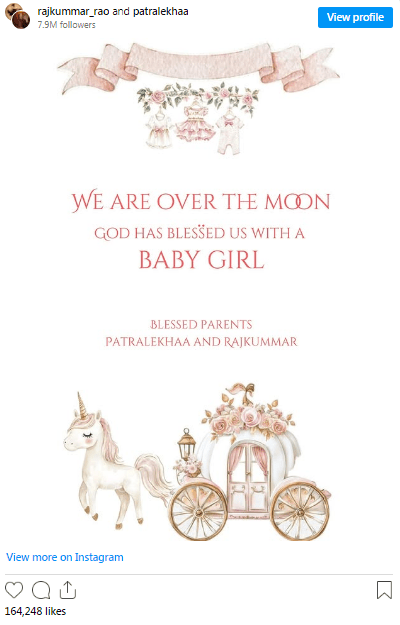 રાજકુમાર રાવ અને પત્રલેખાએ પોસ્ટમાં લખ્યું કે “અમે ખૂબ ખુશ છીએ. ભગવાને અમને એક સુંદર બાળકીનો આશીર્વાદ આપ્યો છે.” આ પોસ્ટ સામે આવતા જ વરુણ ધવન, નેહા ધૂપિયા, અલી ફઝલ સહિત અનેક સેલિબ્રિટીઓએ દંપતીને અભિનંદન પાઠવ્યા છે. સોશિયલ મીડિયા પર ફેન્સ પણ બંનેને શુભેચ્છાઓ પાઠવી રહ્યાં છે.