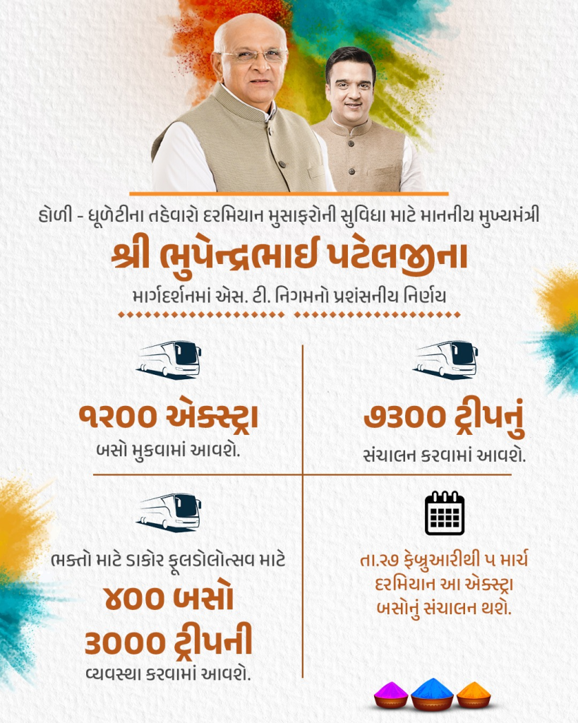 આ વધારાની બસ સેવાઓ ૨૭ ફેબ્રુઆરીથી ૫ માર્ચ ૨૦૨૬ સુધી ચાલુ રહેશે. મુસાફરોને સરળતા રહે અને ભીડથી બચી શકાય તે માટે નિગમ દ્વારા ઓનલાઈન ટિકિટ બુકિંગની સુવિધા ઉપલબ્ધ કરાઈ છે. મુસાફરો નિગમની વેબસાઈટ www.gsrtc.in અથવા GSRTC મોબાઇલ એપ દ્વારા આગોતરા બુકિંગ કરી શકે છે. ઉપરાંત, દરેક ડેપો પરથી પણ વધારાની બસોની માહિતી અને ટિકિટ મેળવી શકાય છે. એસ.ટી.ના આ નિર્ણયથી તહેવાર દરમિયાન મુસાફરી સરળ બનશે અને લોકો પરિવાર સાથે આનંદપૂર્વક હોળી ઉજવી શકશે.