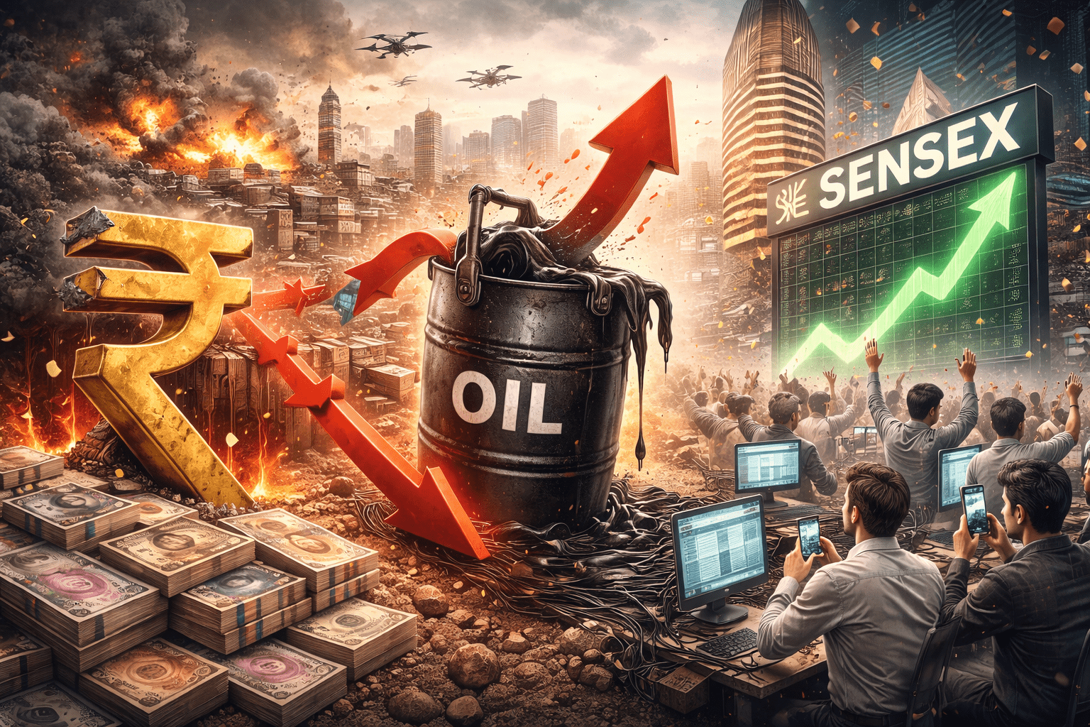 રૂપિયો ઘટ્યો, ક્રૂડ ઓઈલ અને ભૂરાજકીય તણાવનો અસર, શેરબજારમાં ઉછાળો
