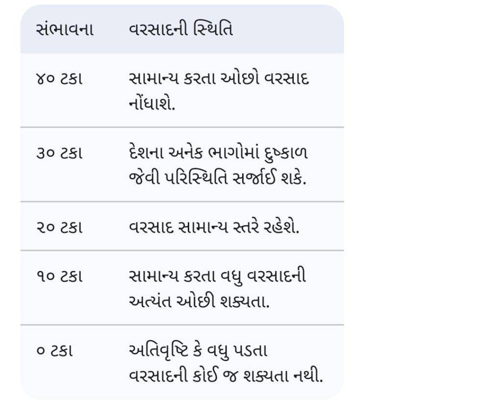 માસિક વરતારો અને વૈજ્ઞાનિક કારણો : હવામાન નિષ્ણાતોના મતે, છેલ્લા દોઢ વર્ષથી સક્રિય ‘લા-નીના’ની સ્થિતિ હવે પૂર્ણ થઈ છે. જોકે, પોઝિટિવ ‘ઇન્ડિયન ઓશન ડાયપોલ’ (IOD) ને કારણે જૂન મહિનામાં શરૂઆત સામાન્ય (૧૦૧ ટકા) રહેશે, પરંતુ ત્યારબાદ વરસાદ સતત ઘટતો જશે: