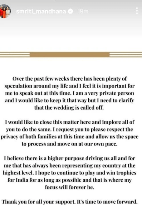 સ્મૃતિ મંધાનાએ પોતાની ઇન્સ્ટાગ્રામ પોસ્ટમાં લખ્યું કે છેલ્લા કેટલાક અઠવાડિયામાં તેમના ખાનગી જીવન અંગે અનેક વાતો ફેલાઈ હતી. તેમણે જણાવ્યું કે “હું ખૂબ ખાનગી વ્યક્તિ છું પરંતુ હવે જાહેર કરવાનું જરૂરી છે કે અમારા લગ્ન રદ કરવામાં આવ્યા છે. હું ઇચ્છું છું કે આ મુદ્દો અહીં જ સમાપ્ત થાય. બંને પરિવારોની ગોપનીયતાનો સન્માન કરવા વિનંતી છે.”