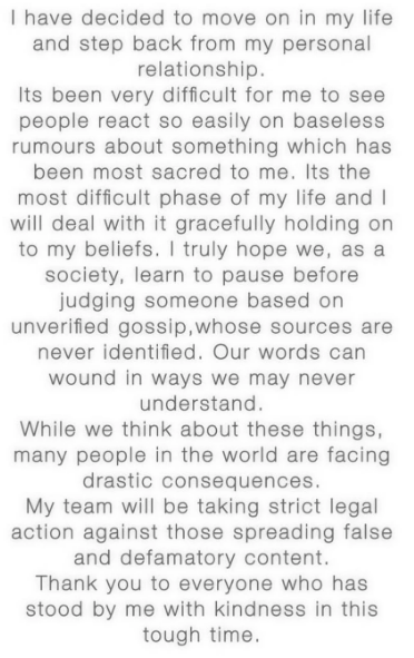 મંધાનાનું સત્તાવાર નિવેદન