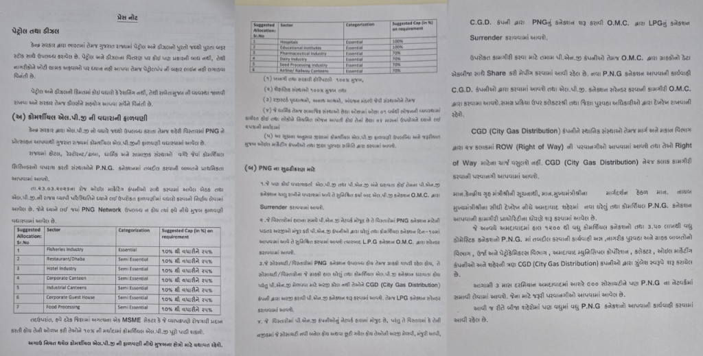 અધિક મુખ્ય સચિવે જણાવ્યું કે હોસ્પિટલો અને શૈક્ષણિક સંસ્થાઓને 100 ટકા LPG સપ્લાય ચાલુ રહેશે. જ્યારે ફાર્માસ્યુટિકલ, ડેરી, સીડ પ્રોસેસિંગ અને એરલાઇન/રેલવે કેન્ટીન જેવા ક્ષેત્રોને 70 ટકા સુધી ફાળવણી કરવામાં આવશે. બાકી અન્ય સેમી-એસેન્શિયલ સેક્ટરમાં 25 ટકા સુધી મર્યાદા રાખવામાં આવી છે.