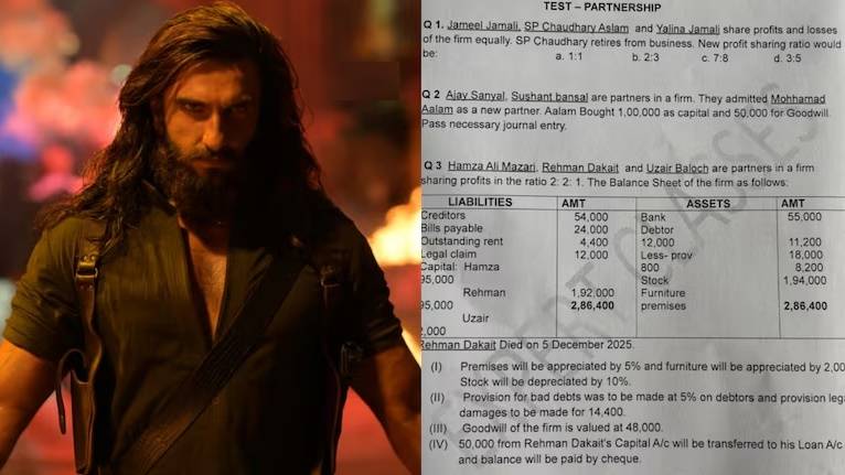 ત્રીજા પ્રશ્ને સૌથી વધુ ધ્યાન ખેંચ્યું. તેમાં હમઝા અલી મજારી રહેમાન ડકૈત અને ઉઝૈર બલોચને 2:2:1 ના ગુણોત્તરમાં નફો વહેંચતા ભાગીદારો તરીકે ઓળખવામાં આવ્યા. બેલેન્સ શીટ તૈયાર કરવાની જરૂરિયાત સાથે પ્રશ્નની અંદર એક ચોક્કસ રેખાએ દરેકનું ધ્યાન ખેંચ્યું: “રહેમાન ડકૈતનું મૃત્યુ 5 ડિસેમ્બર, 2025 ના રોજ થયું.” આ પંક્તિ વાંચીને સોશિયલ મીડિયા વપરાશકર્તાઓએ મનોરંજક પ્રતિક્રિયાઓનો મારો શરૂ કર્યો.