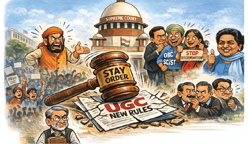 સુપ્રીમ કોર્ટે ગુરુવારે યુનિવર્સિટી ગ્રાન્ટ્સ કમિશન (UGC) ના નવા નિયમો પર રોક લગાવતાં કહ્યું કે તેમની જોગવાઈઓ પહેલી નજરે અસ્પષ્ટ લાગે છે. સુપ્રીમ કોર્ટે જણાવ્યું હતું કે આ નિયમોનો દુરુપયોગ થવાની સંભાવના છે, તેથી નિષ્ણાતોની સમિતિ તેમની ખામીઓને દૂર કરવા પર વિચાર કરી શકે છે. ભાજપના ઘણા નેતાઓએ જણાવ્યું છે કે સરકાર કોર્ટના નિર્ણયનું પાલન કરશે.