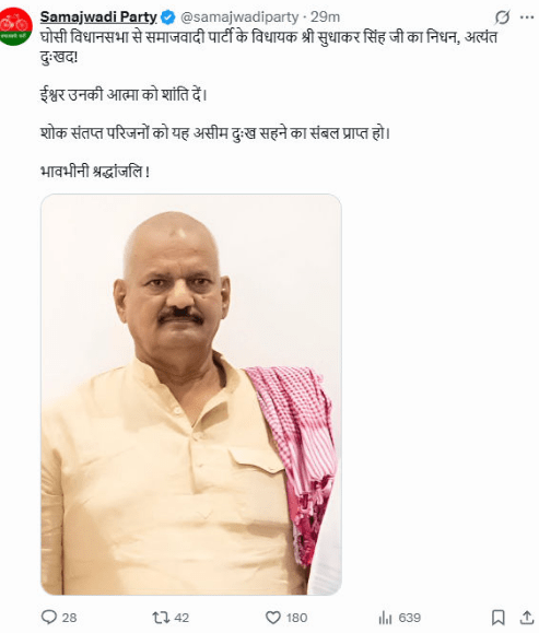 ઉત્તર પ્રદેશના ઘોસી વિધાનસભા મતવિસ્તારના સમાજવાદી પાર્ટીના ધારાસભ્ય સુધાકર સિંહનું લખનૌની મેદાંતા હોસ્પિટલમાં અવસાન થયું છે. 67 વર્ષીય સુધાકર સિંહ છેલ્લા કેટલાક દિવસોથી બીમાર હતા અને સારવાર દરમિયાન આજે સવારે તેમનું નિધન થયું. તેમના અવસાનથી યુપીની રાજનીતિમાં શોકની લાગણી વ્યાપી ગઈ છે.